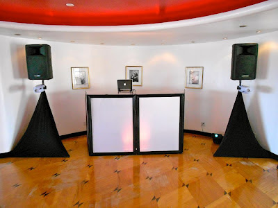 We scrim and uplight our speaker poles and then mount 2 dance lights to each, No messy wires, as well as a nice up-lit DJ facade that hides an 18" bass bottom and our dj control booth!